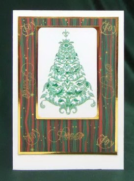 This is the first of 2 cards made by Mary using the Christmas tree clear stamp. The use of the striped red and green backing paper gives this card a modern twist.