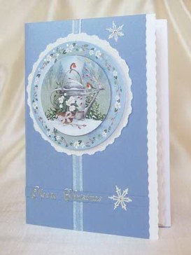 This lovely card uses decorative scissors to cut the circle for the glitter paper backing to the topper. If you find this too tricky, cut a plain circle or use a die cutting machine and Nestabilities scallop circles dies.