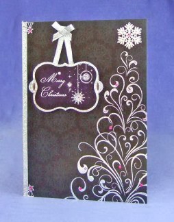 This is the first of 2 cards made by Mary using the Hunkydory Sparkling Tree set of card toppers and coordinating backing card. For this card Mary uses one of the backing cards and one of the die cut toppers. The topper is backed by silver mirror card and the ribbon attached to create a hanging picture effect.