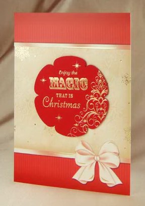 Push out the scalloped Enjoy the Magic of Christmas card topper from the Sentimental Labels card topper sheet. Attach it to the centre of the card using 3D foam pads 10mm square.