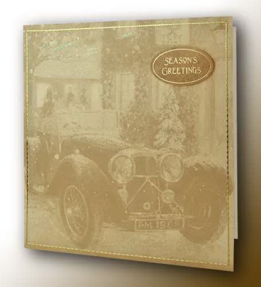 Cut the backing card to 198mm x 198mm so that the vintage car is in the centre. Attach to the creased card using either double sided tape or photo glue.