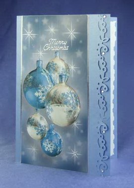 Cut the baubles design from the backing card to 105mm wide. Using a Quickie Glue pen and ultrafine crystal glitter, decorate each bauble with some glitter on right hand side of the bauble only as if light was coming from that direction. Glue to the card approx. 10mm in from the crease line using double sided tape. Add a silver peel off border onto the card at either side of the backing card.